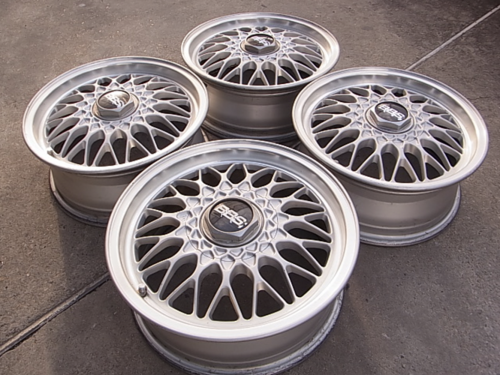 Forged ultra lightweight BBS RG 15 inch aluminum wheels are 4 full set. Forged ultra light design aluminum, light car size. How about a compact car such as a roadster? Wheel size 15 inches, 6 J, 4 H, PCD 100, offset +45. Hub diameter is approximately 54 mm. All 4 air valve caps are engraved with BBS. We will also attach 16 wrench dedicated through nuts and wrench for center cap removal for BBS.