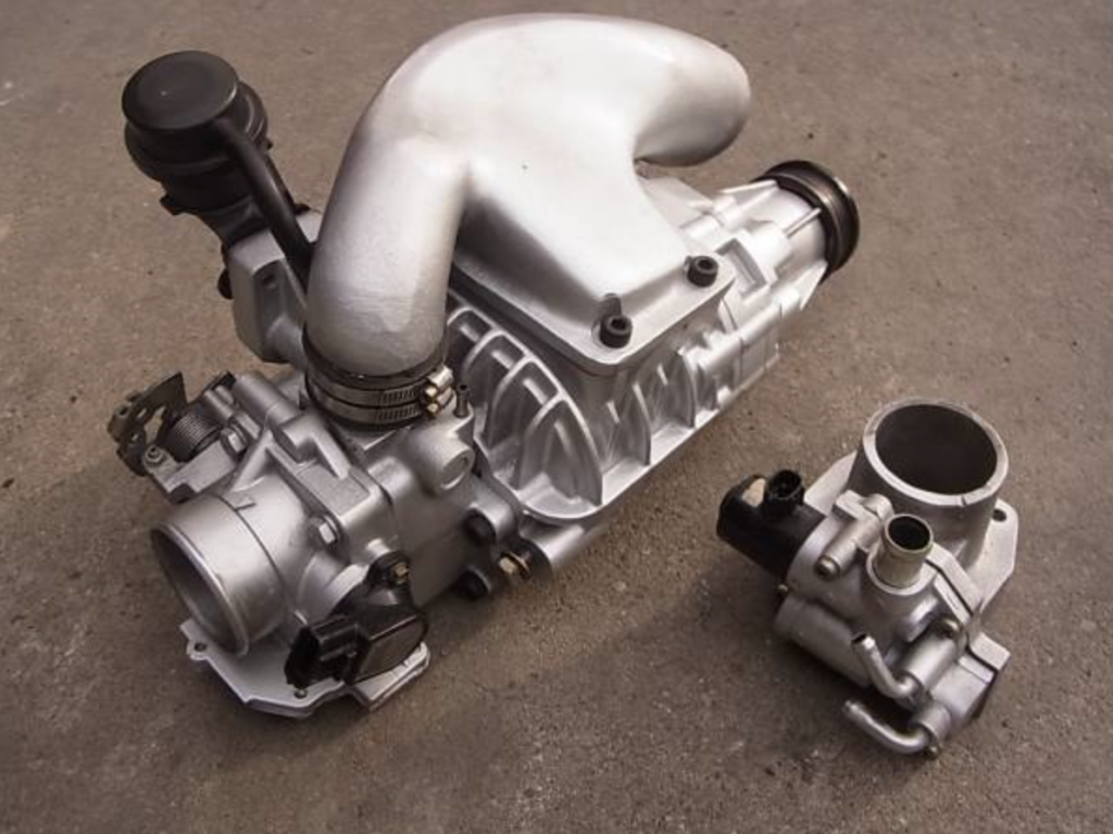 Supercharger body (with genuine throttle), dummy throttle body, crossover pipe, elbow pipe, idler pulley,