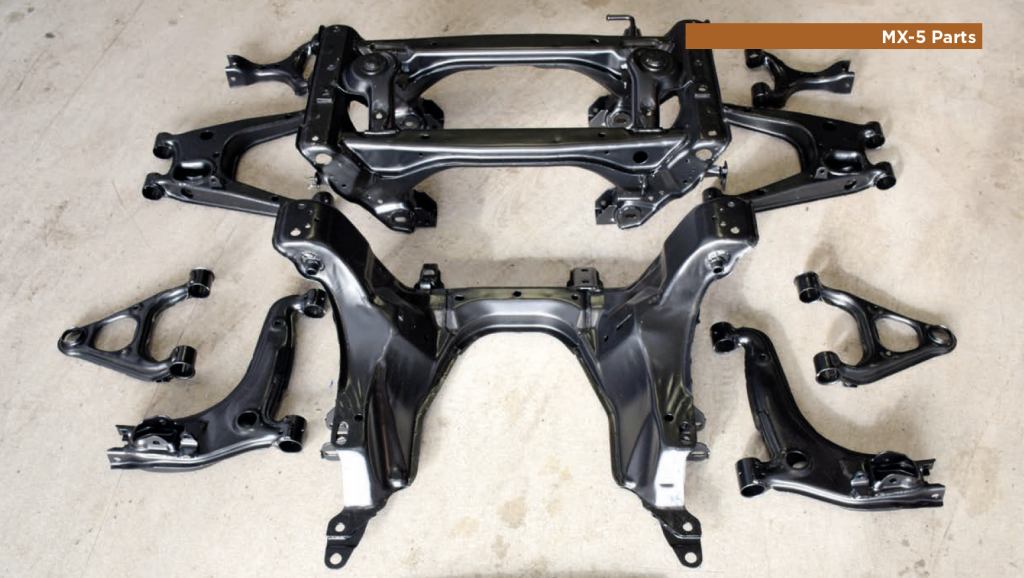 ‘factory’ looking satin black finish. These had come back a few weeks ago, so went over to our friends at LandSpeed in Nottingham for fitment, the work to be undertaken by Adam, one of the outfit’s best qualified techs. The initial plan was that Adam would strip all the old units off, fit the new ones, and then we’d do a deal on LandSpeed keeping the old parts to repeat the process of having ‘new’, powder coated parts sitting on the shelf ready to do an exchange for the next poor unlucky soul that owned a rusty MX-5. In theory, at least, this makes this entire chassis change do-able in a relatively short space of time, rather than having to have a car sat ‘dead’ on a ramp while everything gets taken off and refurbished.