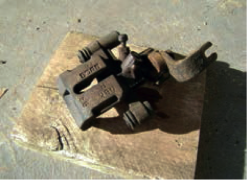 Once I’d removed the caliper from the car, it became apparent from the bleed screw arrangement, the finish of the casting where the brake pipe union mates and the type of piston fitted, that this caliper had been refurbished previously