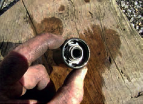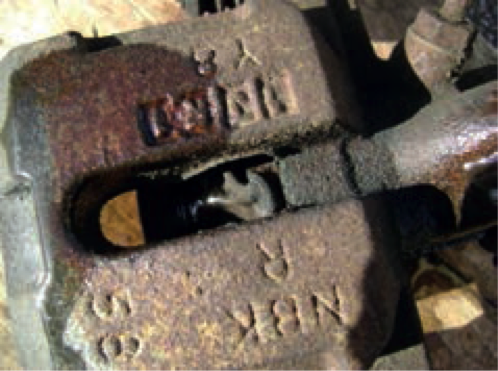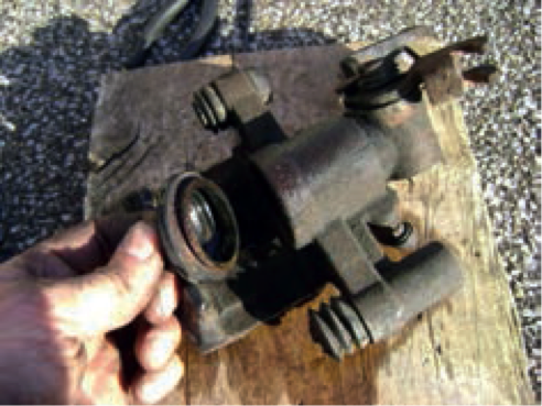 My suspicions became more aroused as the piston extended. Visible through the brake pad inspection hole I could see that the piston dust seal had become dislodged from its recess in the caliper body, allowing water ingress and now, visible rust.