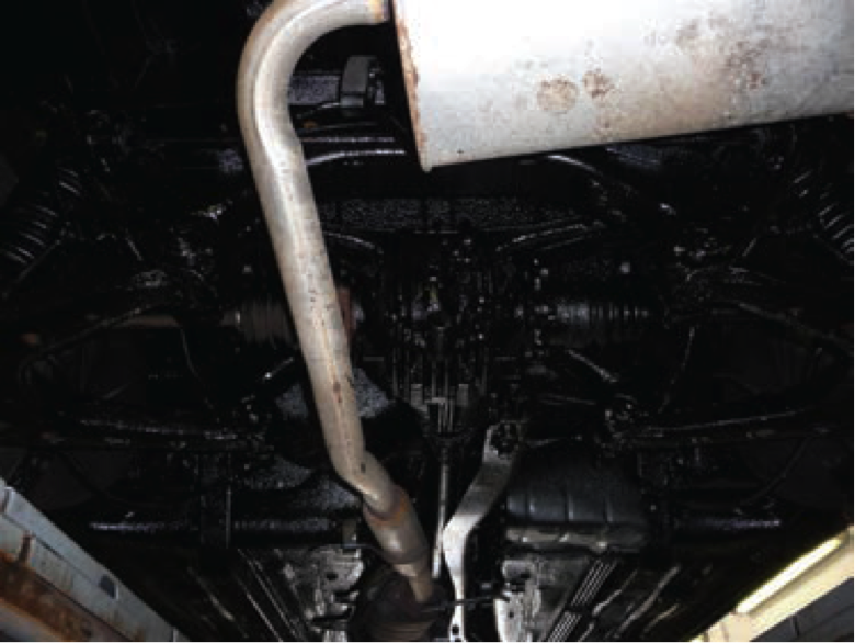 The next stage (after an initial drip dry) is a full compressed air drying of the underside, including all box sections. Bone dry is not necessary as all the Waxoyl products used are water displacing and injected under pressure so you can be sure that everything is covered. Preparation (which really is the most important phase) was now complete and the car was transferred to the workshop for treatment. A 4-point lift on the chassis rails is used to ensure that all underbody and wheel arch areas can be easily reached. All box sections (chassis rails, crossmembers, subframes, sills, wishbones, etc.) are treated with a clear wax spray which is injected at high pressure as a “mist” coating.