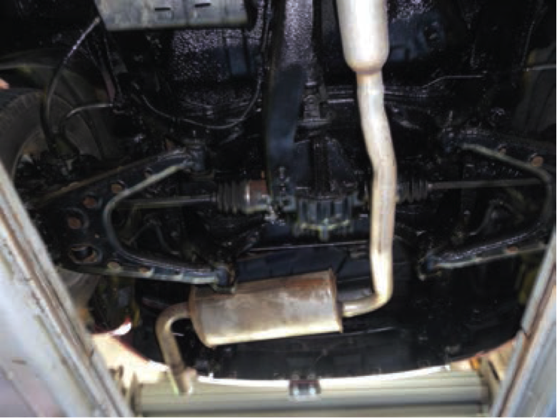 With internal cavities done the wheel and brake areas were masked off in preparation for the main coating. Again using a high pressure spray the entire underside area (apart from the exhaust) was covered with a thick black hard wax coating, which resembles a traditional underseal. However, this Waxoyl product penetrates and kills existing rust, remains flexible and can be “topped up” with additional treatment if worn or damaged. As you can imagine this process takes some time to complete and Ben (who did my car) was very thorough and careful to make sure every bit was covered correctly.