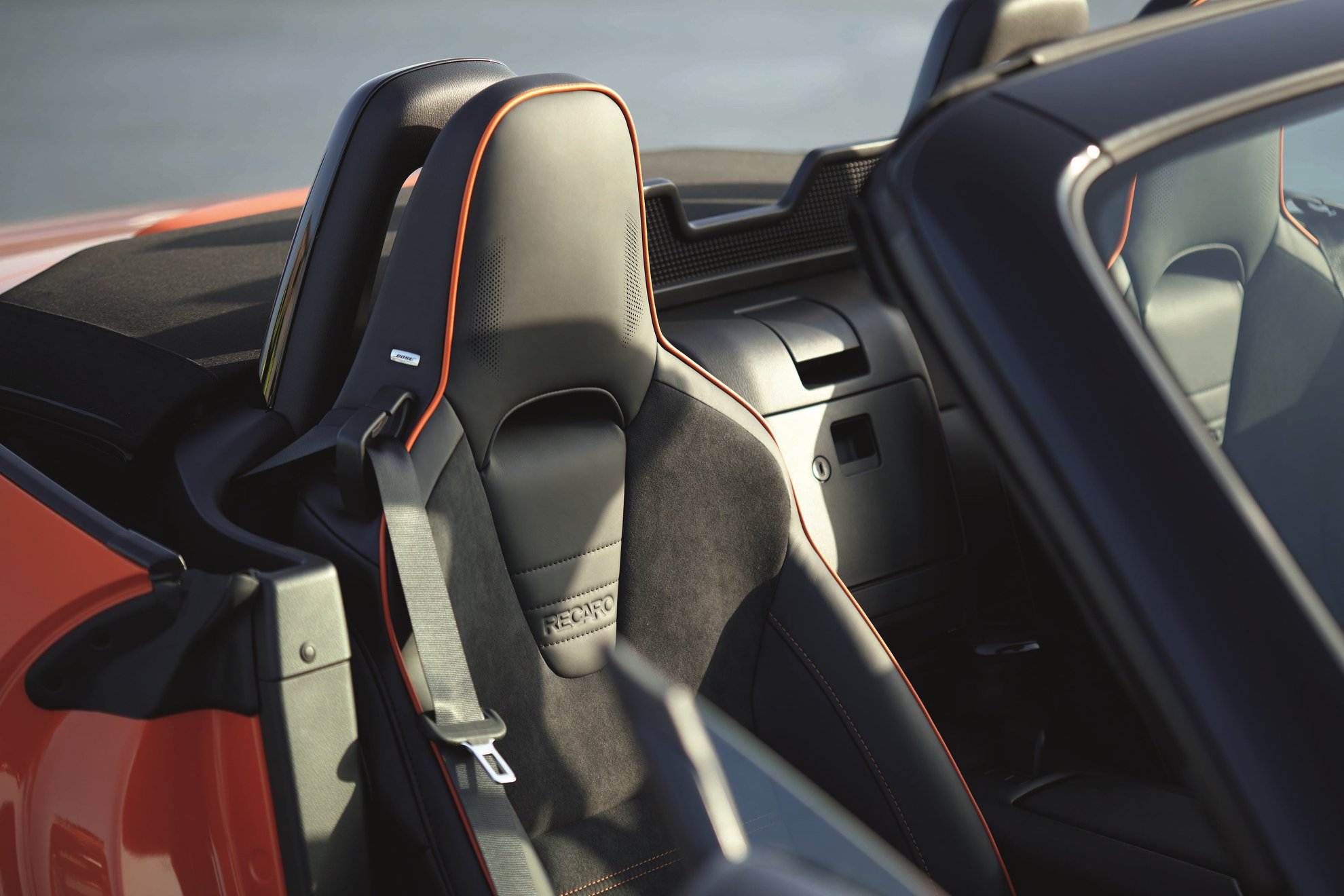 Compared to the rivals – GT86, BRZ, 124 Abarth etc. the MX-5 came across as a softer looking choice, but not now. Racing Orange shows off the gaping mouth and gives the car some serious intent, and those ubiquitous Recaros retrimmed with orange piping tie it all together nicely, too.