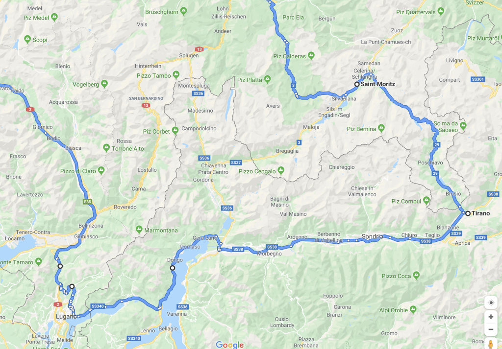 With hunger replenished by fondue, I’d drop over the other side and cross into Italy at Tirano. My sprint would turn westwards toward Lake Como, kissing its north eastern shore at sunset. I’d pause for an Aperol Spritz and a bowl of pasta in the pretty village of Menaggio because, well, that’s what you do at Lake Como, irrespective of the circumstance. I’d then head inland and cross back into Switzerland, aiming to find another cheap highway hotel near Lugano. If I was feeling up to it, I’d down a can of Red Bull and make the highway schlep in the darkness a few hours north, putting me in a prime location to begin Sunday morning in the Alps.