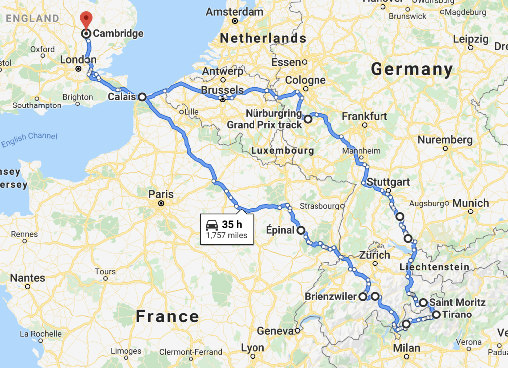 I’d start by spending my lunch break on Google Maps, which I’ve just done. I’d sweet-talk my way out the door a little early, call past home to grab the MX-5 and a change of clothes, and make a sprint for Dover. Booking last minute, I can get a 930pm Euro Tunnel train for £112, and that’ll do just fine.