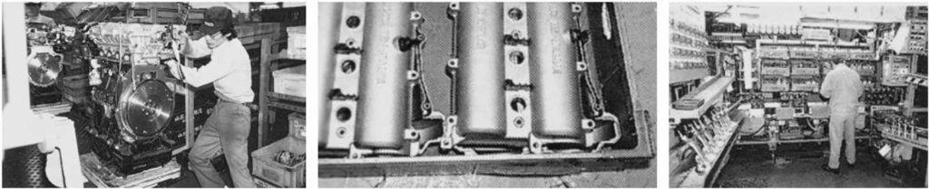 Approximately 30 staff assembled 500 4-cylinder B-type engines a day. Of these, 27% were used in the MX-5. reportedly it took about 2 hours to assemble one engine. Assembling the connecting rod and piston and inserting them into the cylinder block is done by hand. After that auxiliary equipment such as the oil pan, flywheel, and water pump are installed. Adjustments were implemented on the test line.