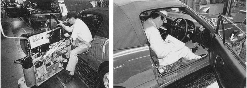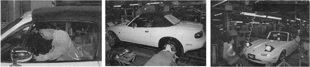 The completed body is painted on the welding line over a period of approximately 8 hours and sent to assembly where approximately 260 staff members spent 3.3 hours assembling an MX-5 on a line covering a length of 5,008 m.