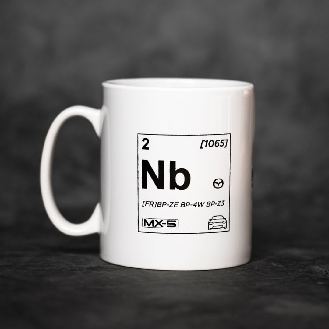 Celebrate your MX-5 with this white ceramic coffee mug featuring a Club exclusive design inspired by the elements of the periodic table. The front showcases the car’s generation designation presented in a detailed element-style square, incorporating key MX-5 facts; weight, badge design and engine designation. On the reverse, all four MX-5 generations are displayed with the distinctive Elementally MX-5 graphic.
