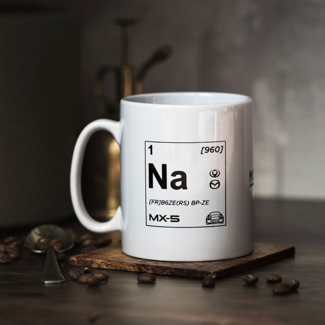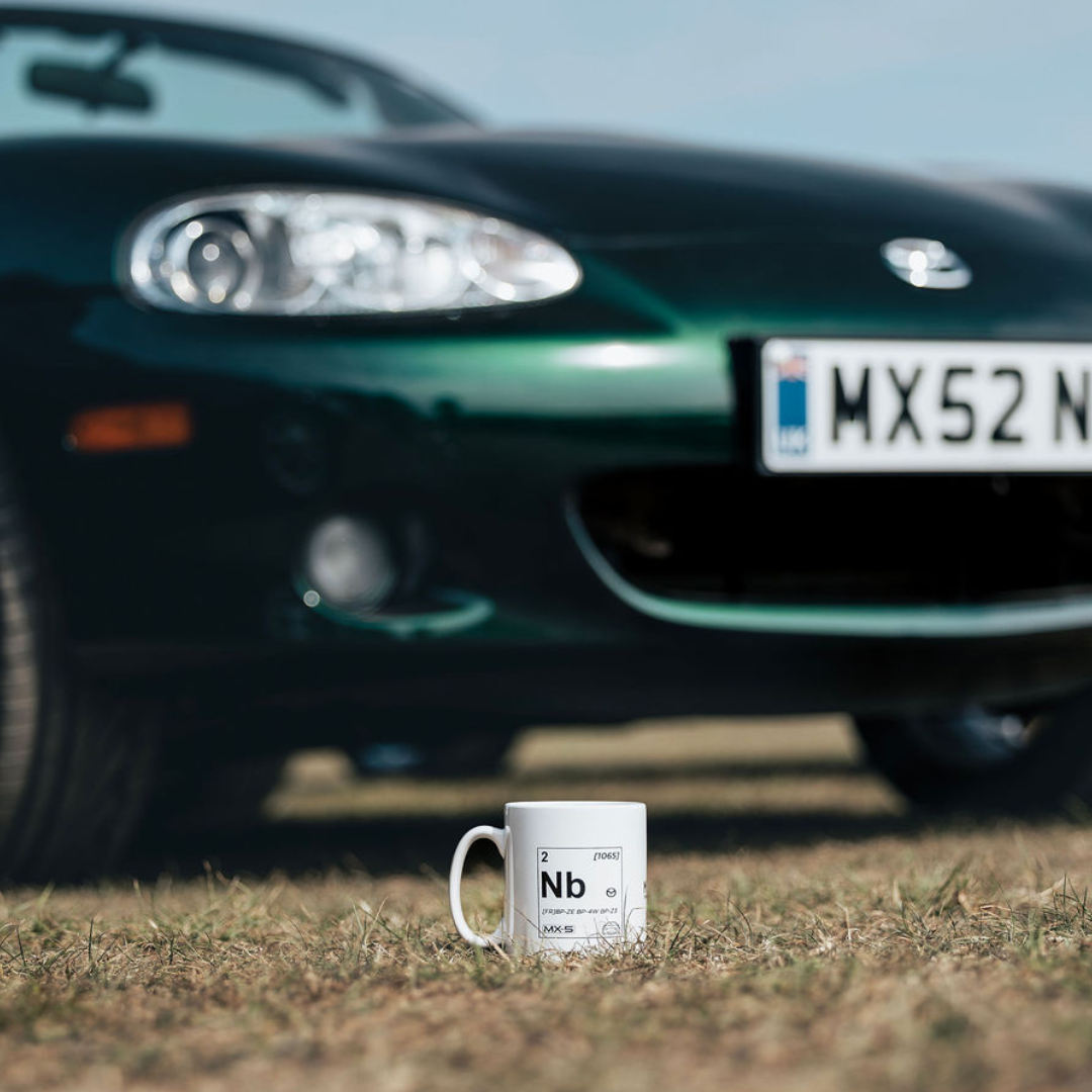 Celebrate your MX-5 with this Club-exclusive ceramic mug inspired by the periodic table. The front features an element-style square highlighting the car’s generation and key MX-5 details, while the reverse showcases all four generations alongside the Elementally MX-5 design.